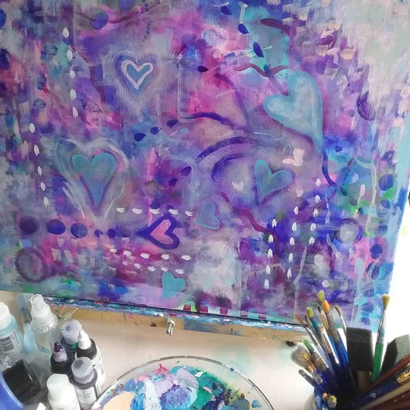 There are days when I paint for less than five minutes. And that’s okay. There are times I paint a few hearts or circles or squares in the morning, and then paint a few more in the afternoon. That’s fine too. Sometimes I fill an entire page with paint, at other times one page represents a week’s worth of painting a small bit every day, and at other times I’ll spend weeks or more painting on a single canvas. All of that is also satisfying and good, as far as I’m concerned.